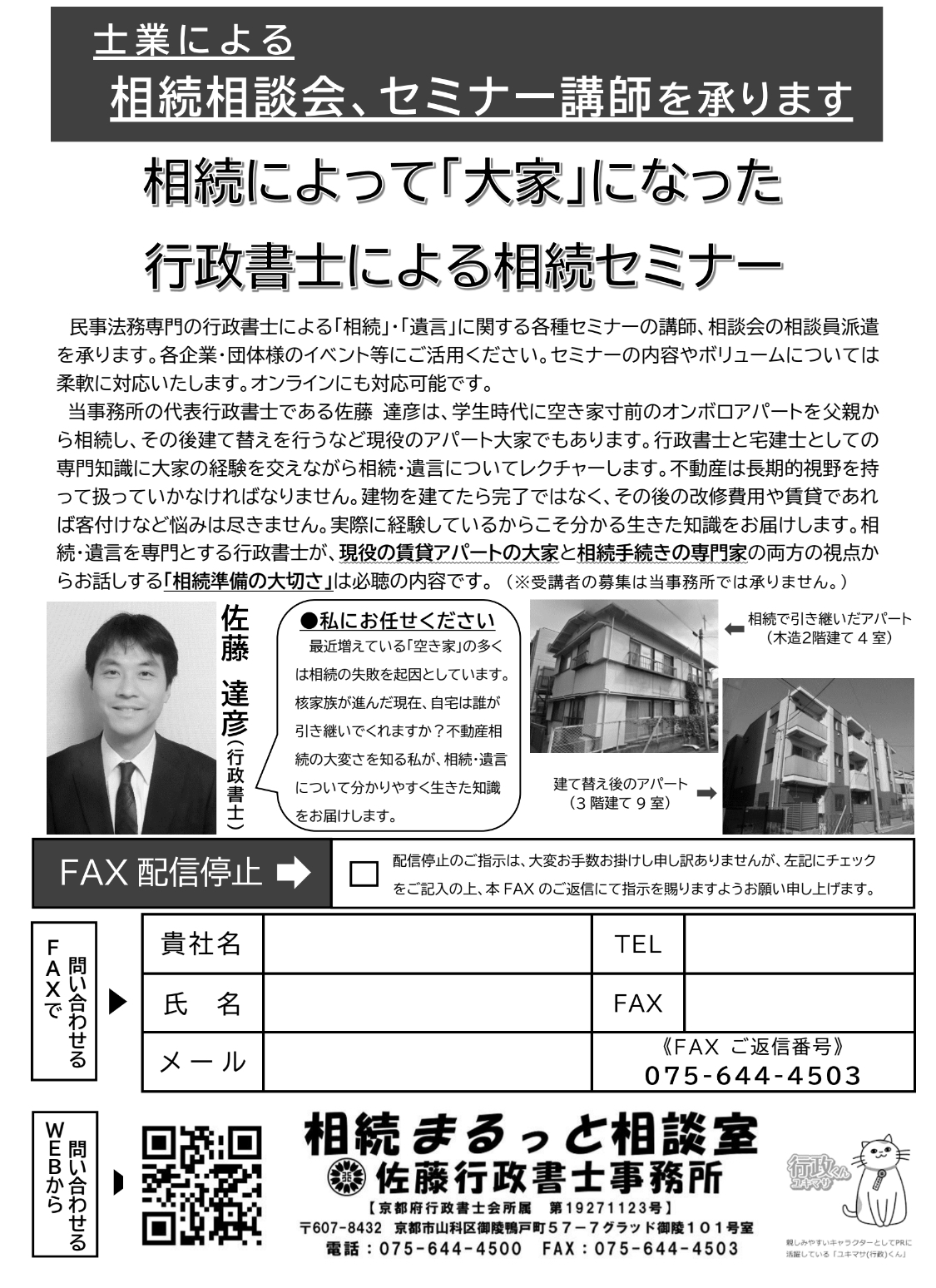当事務所の代表行政書士である佐藤 達彦は、学生時代に空き家寸前のアパートを父親から相続し、その後建て替えを行うなど現役のアパート大家でもあります。行政書士と宅建士としての専門知識に大家の経験を交えながら相続・遺言についてレクチャーします。